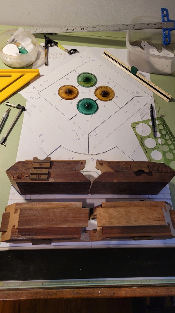 Pairs of 18″ square panels, long hexagons, and trapezoid frames made for fun. Taking stock of some materials I’ve collected over the years and seeking appropriate uses for them in smaller scale projects. I plan to expand this group as time permits.